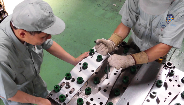 80t~200tプレス機5台編成のRY-ロボットラインを主体に、省人化によるプレス生産を行っています。また(株)アイダ製の300t-PMXを筆頭とした自動機プレス設備も保有しており、大量生産から小ロット多品種まで、お客様のさまざまなニーズにお応えしています。当社には、金型の製作からさまざまなな機械を駆使したプレス加工、精密機械加工に至るまでの各種専門技術を有するスタッフが在籍し、日常の金型メンテナンス、変更対応等を自社で行えるのが強みです。